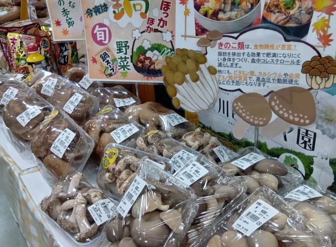 きのこが美味しい季節になりました。森の茶屋売店ではしいたけを始め、きのこ類が入荷されています。しいたけには腸内環境を整える効果や、血糖値の上昇を緩やかにする効果、コレステロール値を低下させる効果があります。ヘルシーなしいたけが入ったあたたかいお鍋はいかがでしょうか? また、普通のしいたけより大きい「ジャンボしいたけ」も入荷しております!ステーキにしても美味しいですよ。
